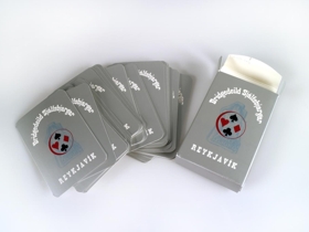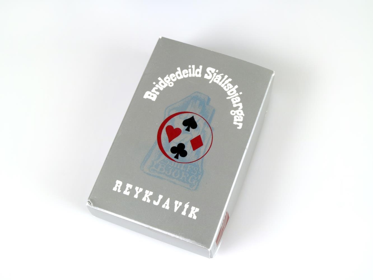 Spilastokkur í pappaöskju. Askjan og bakhlið spilanna eru silfurlit. Framhlið og bakhlið öskjunnar og bakhlið spilanna líta eins út. Á þeim stendur ofarlega: Bridgedeild Sjálfsbjargar. Í miðju er merki Sjálfsbjargar (Sjálfsbjörg - landssamband hreyfihamlaðra) og ofan á því er prentaður hringur með spaða, hjarta, tígli og laufi innan í. Neðarlega stendur: Reykjavík. Á báðum hliðum öskjunnar er rautt merki með textanum: Stanz.