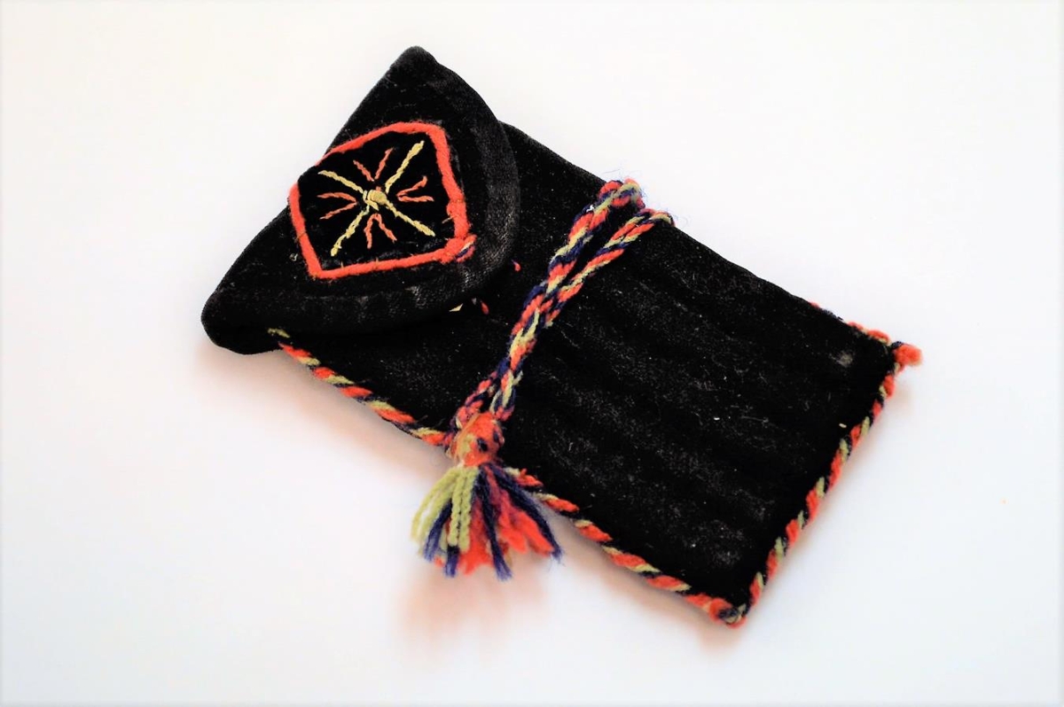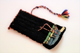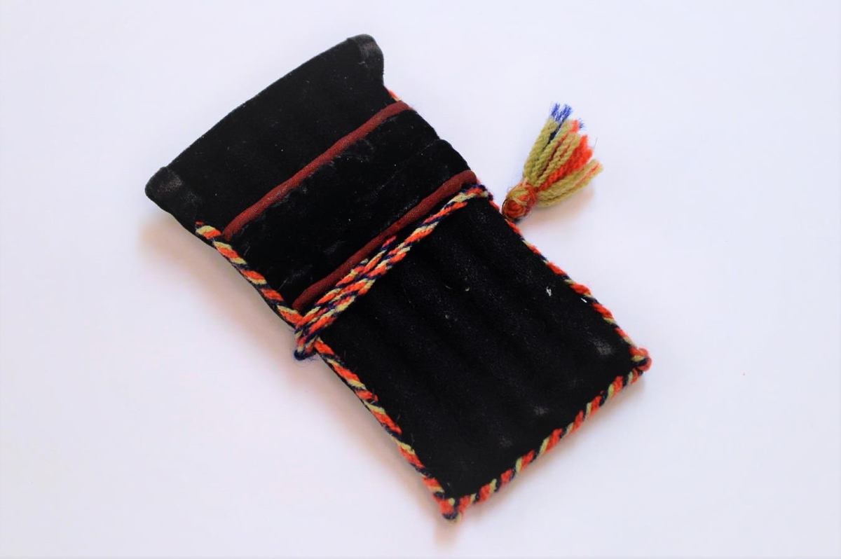 Fjaðranálhús, saumað af Þuríði Jónsdóttur ljósmóður í Hvammi undir Eyjafjöllum, stærð 10,5 x 6 cm. Svart bómullarefni með bryddingum úr snúnu garni í rauðu, hvítu og bláu. Lok bryddað með svörtu efni og er útsaumaður rauður tígull með stjörnu sem er hvít og rauð í svart flauel. Á bakinu er bútur saumaður þvert og er hann úr svörtu flaueli og bryddaður með rauðu. Lok fest með snúnu garni eins og bryddingin og fóðrað með bláu en grænt fóður er utan um stafina sem eru fimm.