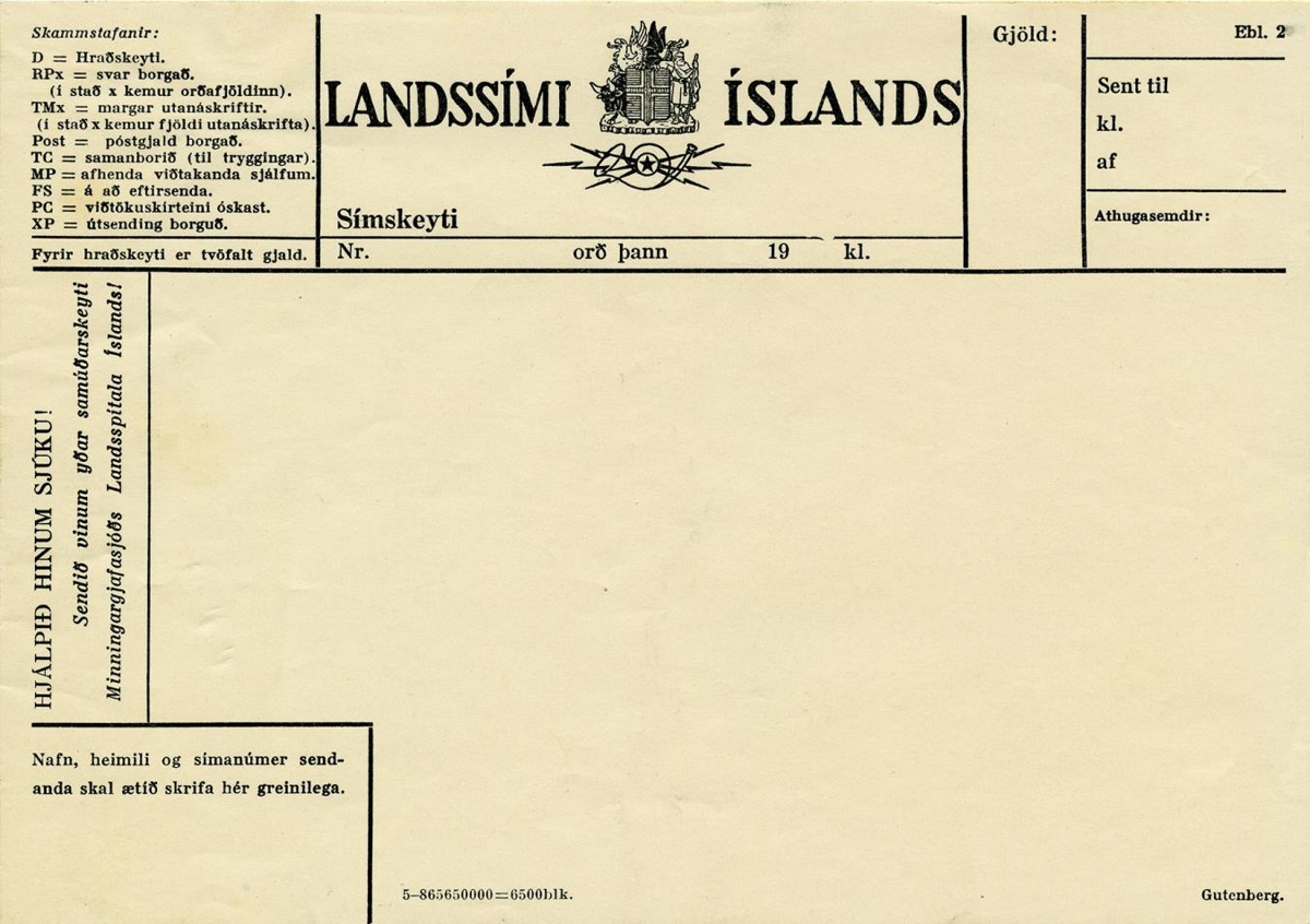 13 eyðublöð fyrir sendingar á símskeytum hjá Landssíma Íslands. Á eyðublaðinu er að finna skammstafanir fyrir þá sem vinna við sendingu símskeytanna og ýmsa reiti til að fylla út. Eyðublöðin eru prentuð af Gutenberg.