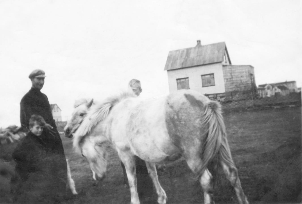 Guðmundur Þórarinsson frá Gerðum í Garði með sonum sínum Jónasi og Mgnúsi í hestagerði fyrir neðan Efri Sjólyst í Garði.