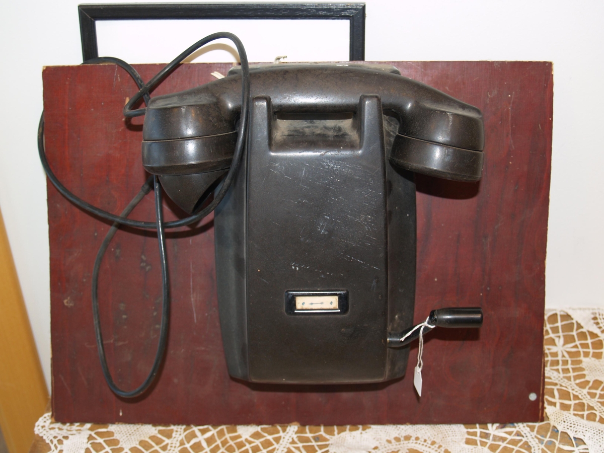 Svartur veggsími með sveif. Gunnar Ólsen verkstjóri notaði þennan síma í vegavinnuskúr á leiðinni til Þorlákshafnar. Þá þurfti hann að hringja í gegn um símstöðina í Hveragerði.