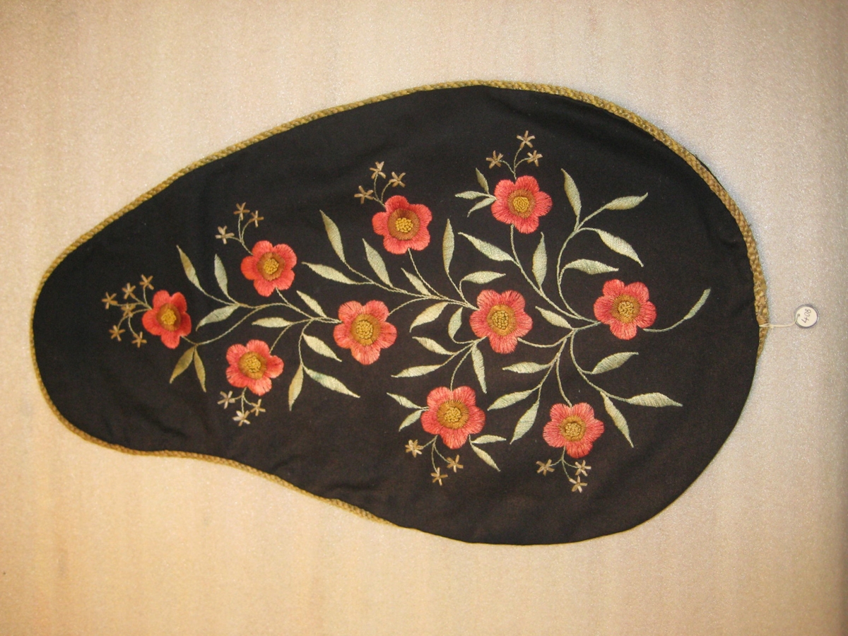 Söðulsessudúkur úr svörtu klæði með ísaumaðri fagurgerðri rós með grænum og rauðum blöðum. Þessa sessu átti Ólafía Jónsdóttir á Svínavatni í Grafningi, rósina saumaði Sigríður systir hennar eftir munstri frá Guðrúnu Erlings - konu Þorsteins skálds.