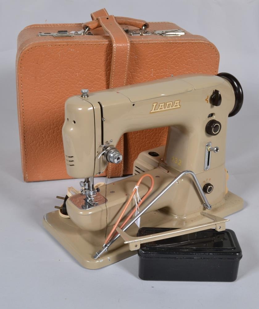 Brún saumavél frá Lada í brúnni saumavélatösku.