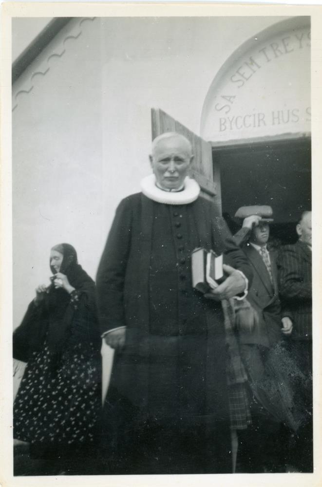 Prestur stendur fyrir utan kirkju, með kraga um hálsinn, í dökkri hempu og með bækur undir handleggnum. Vinstra megin við hann sést kona í mynstruðu pilsi eða kjól og hægra megin við hann sjást kirkjugestir fara út.
