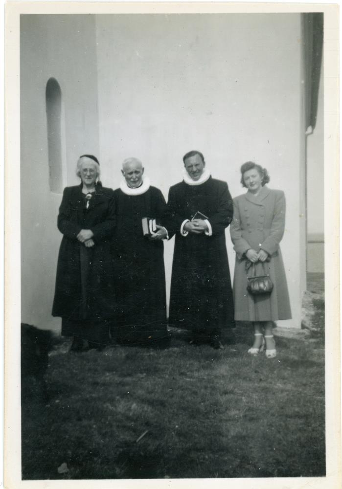 Fjórar manneskjur eru á myndinni. Til vinstri er kona, erfitt að sjá hvort hún sé klædd í peysuföt en hún er með skotthúfu á höfði. Hægra megin við hana stendur eldri maður, prestur klæddur kraga og hempu með bækur undir hendi. Hægra megin við hann er fullorðinn maður, einnig prestur klæddur kraga og hempu og heldur báðum höndum utan um bók fyrir framan sig. Lengst til hægri er kona klædd kápu, ljósum hælum og heldur á lítilli tösku fyrir framan sig.