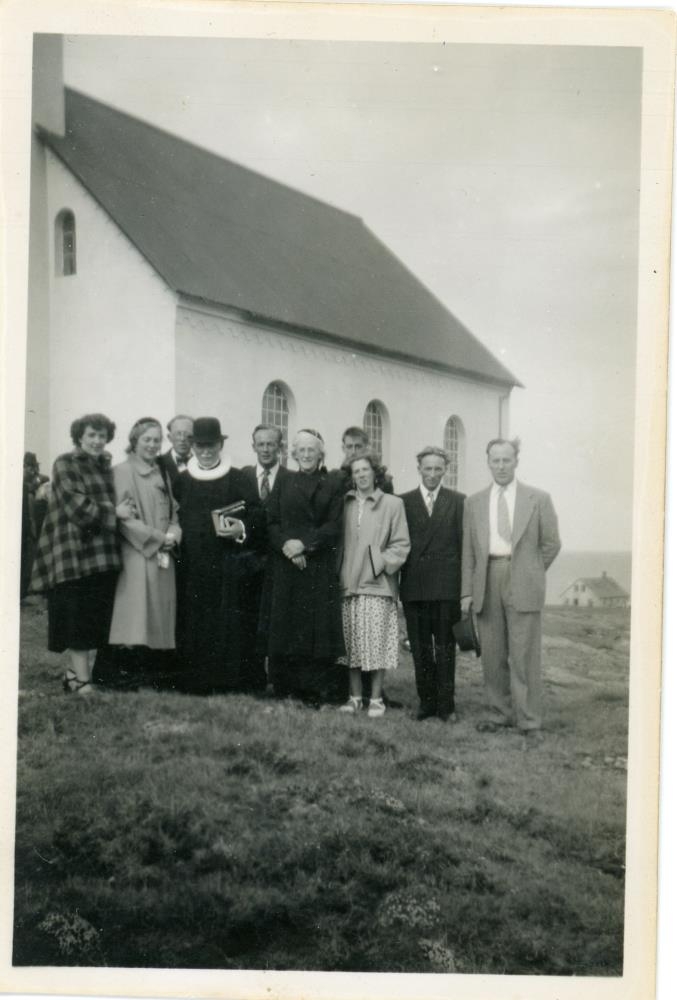 Hópur prúðbúins fólks stendur fyrir utan kirkju, konur og karlar. Til vinstri í hópnum er prestur í hempu, með kraga og hatt á höfði og hægra megin við hann er kona klædd peysufötum og með skotthúfu.