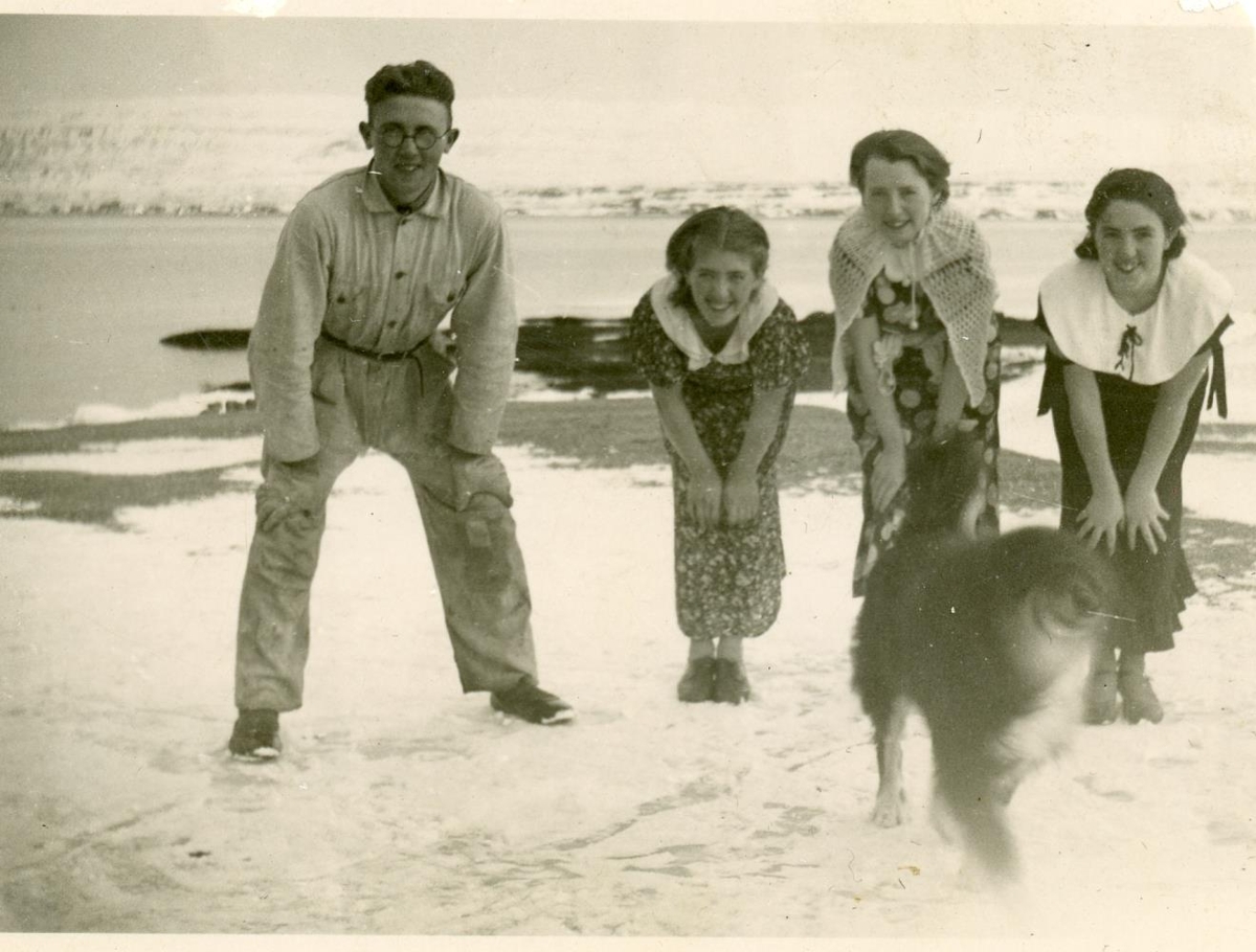 Fjórar ungar manneskjur eru á myndinni, sem halla sér allar áfram með hendur á hnjám. Frá vinstri er ungur maður, í ljósum fötum, buxum og skyrtu sem er girt ofan í þær, og kringlótt gleraugu. Hægra megin við hann er ung kona, klædd í mynstraðan kjól með kraga. Hægra megin við hana er önnur ung kona, einnig í mynstruðum (gætu verið blóm) kjól og líklega með sjal utan um axlirnar. Lengst til hægri er sú þriðja, með stóran hvítan kraga og kjól. Fyrir framan þær sem eru til hægri er hundur, mögulega að hrista sig því myndin af honum er svo óskýr. Þau standa á snjóbreiðu, með sjó fyrir aftan sig og fjöll þar fyrir aftan.