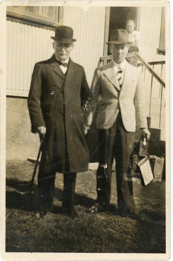Tveir karlmenn standa hlið við hlið á myndinni. Maðurinn til vinstri er eldri, dökkklæddur, með staf í hendi og hatt á höfði. Maðurinn hægra megin er yngri, í ljósum jakka, einnig með hatt og heldur á einhverju ógreinilegu. Fyrir aftan þá er bárujárnshús, tröppur og kona sem stendur efst í þeim hjá inngangi.