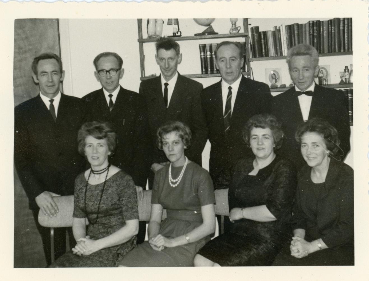 Níu manns eru á myndinni. Í aftari röð standa fimm fullorðnir karlmenn, allir klæddir jakkafötum og með bindi. Fyrir framan þá sitja fjórar konur, allar klæddar fínum kjólum. Konan lengst til vinstri er með dökka perlufesti og sú sem er hægra megin við hana er með ljósa perlufesti um hálsinn. Fyrir aftan hópinn eru hansahillur með bókum og skrautmunum.