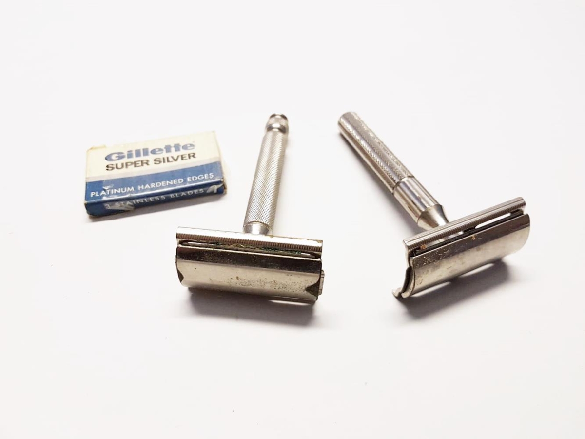 klassísk gerð. Rakvélablöð í þeim báðum. Kassi með blöðum fylgir með frá