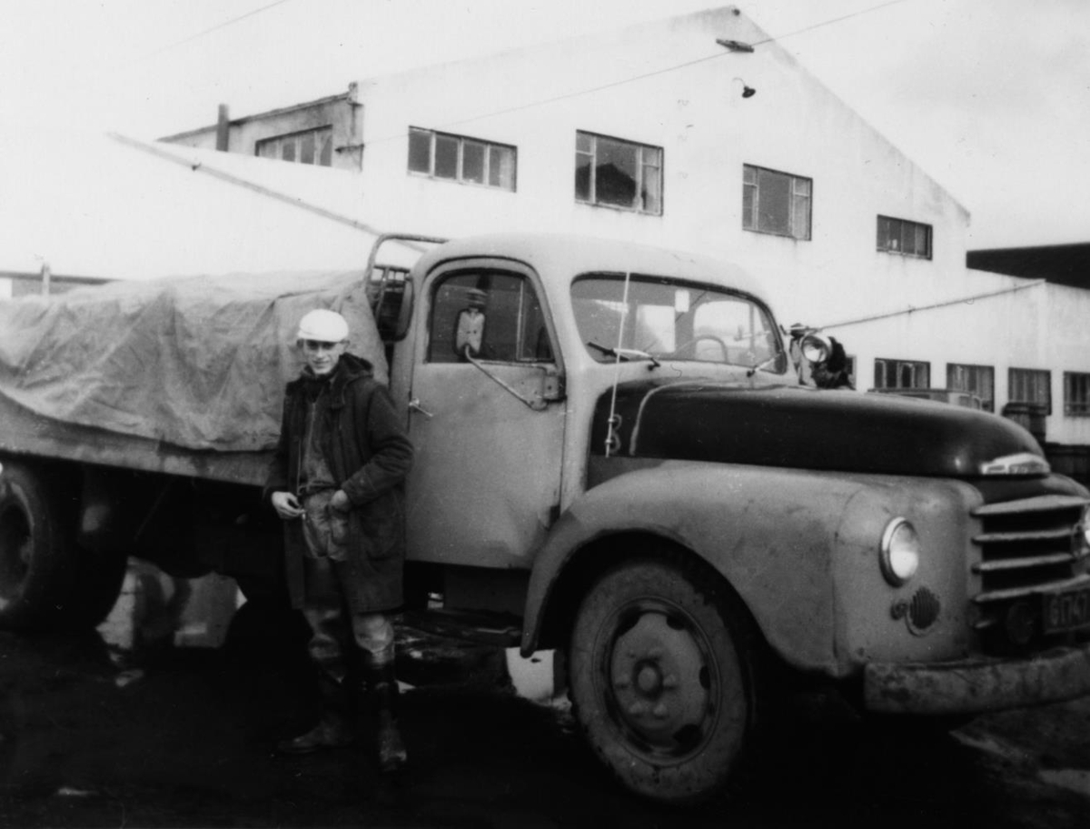 Myndin tekin við Hraðfrystihús Gerðabátanna í Garði, Sigurjón Kristinsson frá Lónshúsum í Garði fyrir framan bílinn.