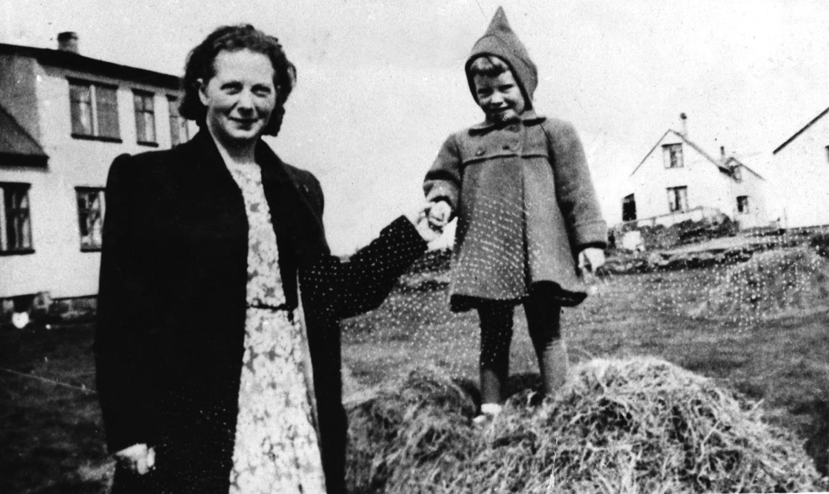 Guðrún Guðmundsdóttir, kona séra Eiríks Brynjólfssonar prests á Útskálum í Garði ásamt ungu barni úti í góðviðrinu.