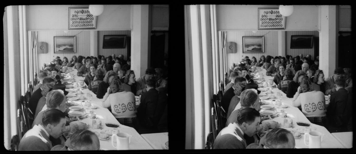 Hólaför Prentara. Setið til borðs. Samsæti í skóla um 1940. Fremst t.v. Tómas Albertsson.