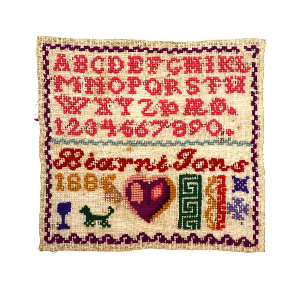 Nafnaklútur, stafaklútur. Bjarni saumaði klútinn í Barnaskóla Reykjavíkur árið 1886. Bókstafir og tölustafir saumaðir í efri hluta klútsins. Nafnið Bjarni Jons og ártalið 1886 saumað í neðri hlutann ásamt nokkrum stökum munstrum. Mjór munsturbekkur í miðju og utan um klútinn. Allt saumað með krosssaumi. Örmjór faldur brotinn inn af efninu á þrjá vegu, er nær óslitinn. Stærð: 19,5 x 20,5 cm.