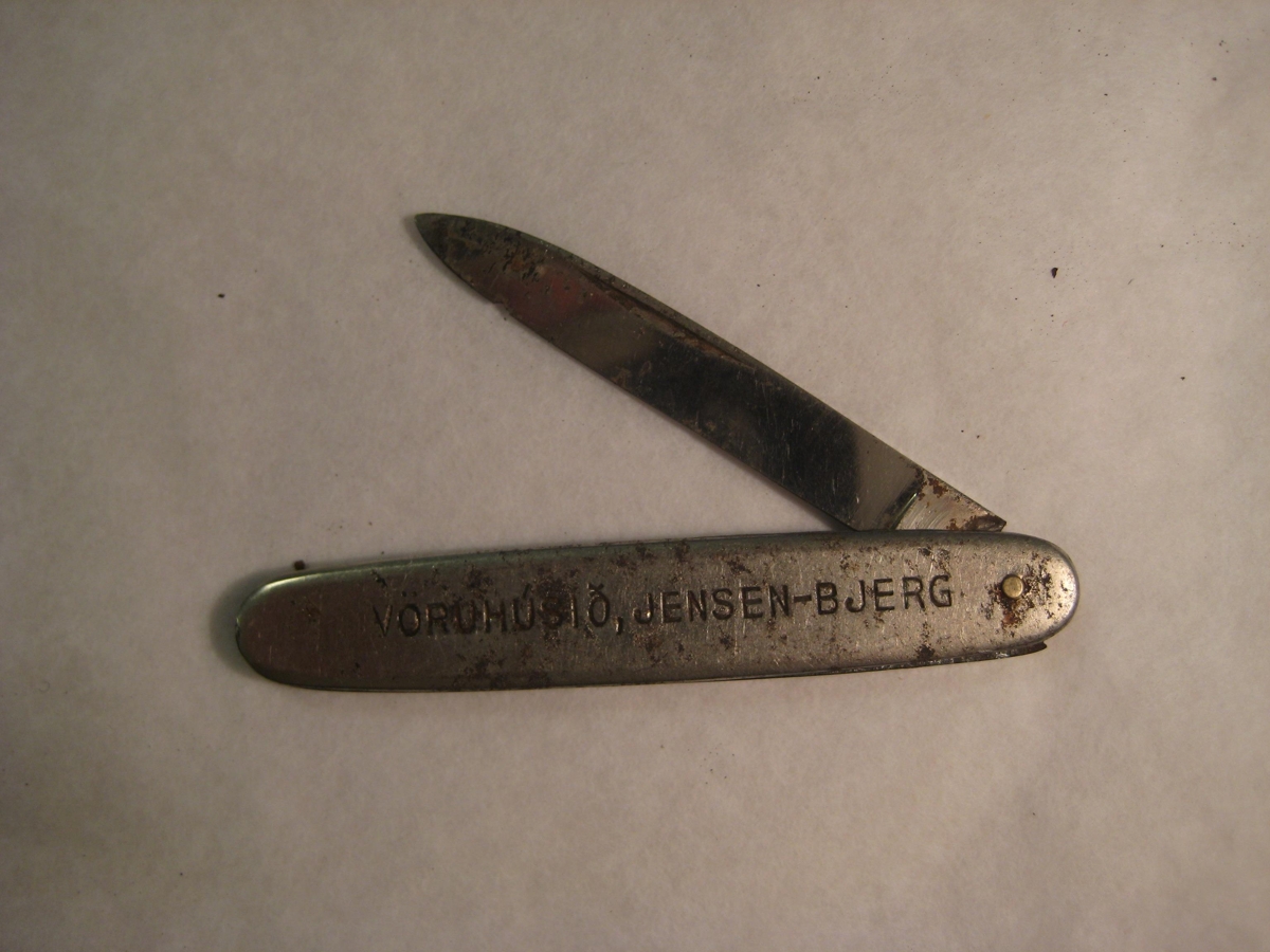 Úr sama málmi áletrun vöruhúsið Jensen Berg. Hnífurinn var til á Miðengi í Grímsnesi, hugsanlega úr eigu föður gefanda.