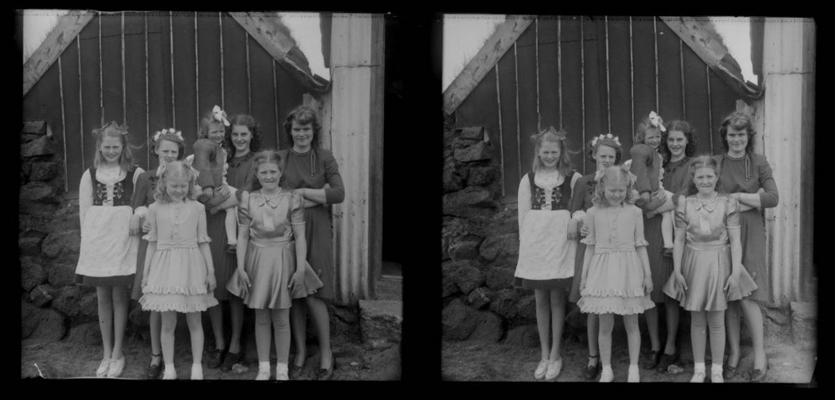Stokkseyri. Ungar stelpur í sparifötum undir húsgafli í Baldurshaga. Hlóðaeldhús sem var við hlið á bænum.