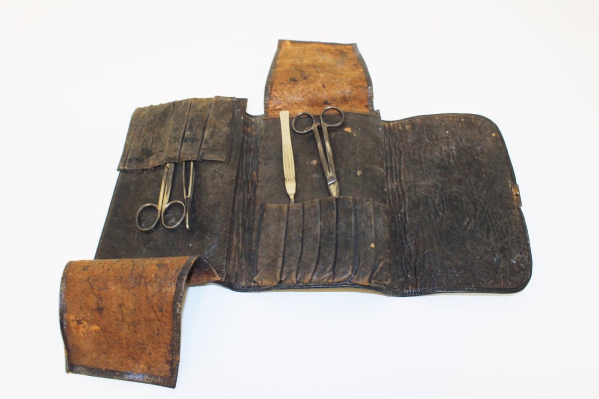 Veski með áhöldum dýralæknis. Veski með áhöldum tengdum dýralækningum, en Magnús í Skógsnesi stundaði dýralækningar. Gripur frá Skógsnesi í Gaulverjabæjarhreppi. Úr fórum Magnúsar Þ.Öfjörð, föður Margrétar sem gaf á safnið.
