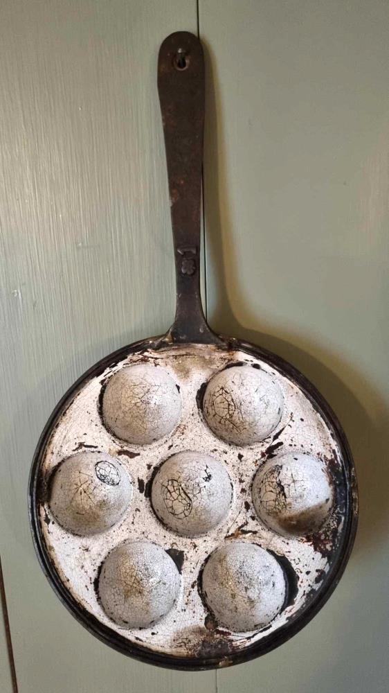 Eplaskífupanna fyrir 7 skífur. Með járnhring utan um."Sem ung stúlka fór móðir mín, Þóra Daníelsdóttir Stephensen dáin árið 1981. Fór í vist til Nielsen hjónannna, síðustu faktorshjónanna í Húsinu á Eyrarbakka. Og vann þeim einhver ár, sennilega þar til þau fluttu utan. Er þau komu hingað upp aftur, eftir seinni heimsstyrjöldina, tókust góð tengsl milli þeirra og foreldra minna, Þóru og Ólafs Stephensen, sem lengst var ökumaður hjá Sláturfélagi Suðurlands. Að Nielsenhjónunum látnum gaf Eugenia dóttir þeirra móður minni eplaskífupönnuna, sem móðir hennar hafði átt og notað í Húsinu. Móðir mín gaf konu minni Dagbjörtu G. Stephensen pönnuna er hún hætti að halda heimli sjálf. Þær notuðu pönnuna báðar en nú er notkun hennar hætt, og við hjónin vildum gjarnan að Byggðasafn Árnesinga tæki við henni og hefði hana í Húsinu sé það talið rétt."