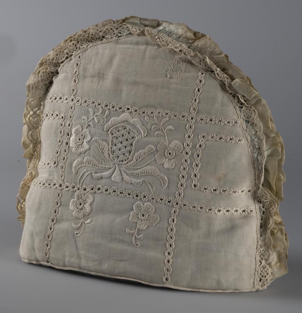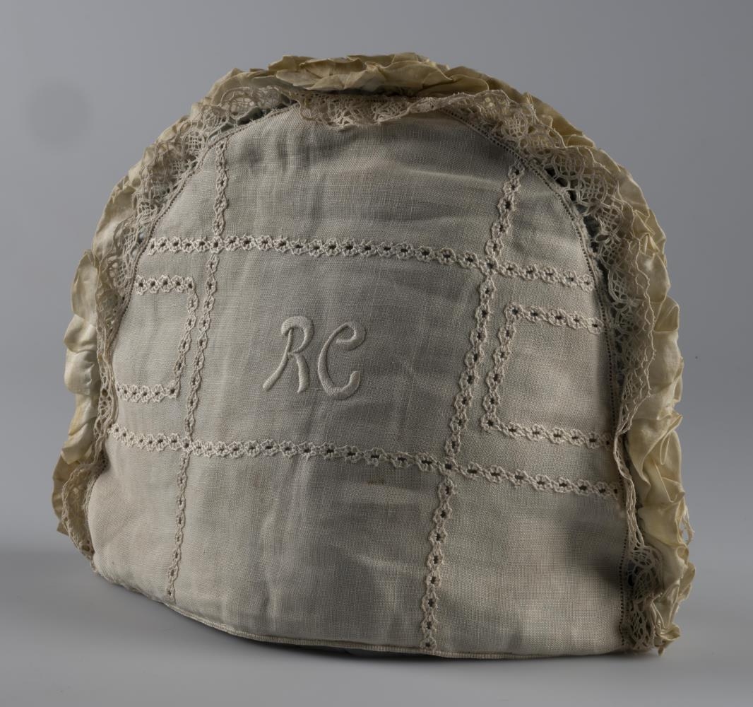 Útsaumuð tehetta. Á annarri hlið tehettunnar eru saumaðir bókstafirnir RC og á hinni hliðinni er blómamunstur. Meðfram kanti tehettunnar er blúnda.Tehettan er hvít að utan en að innan er blátt efni. Á tehettunni eru margir blettir, einkum að innan.Tehettan var gefin til safnsins árið 2022 og í sömu gjöf voru einnig fjórir dúkar (nr. 2022-8-1 og 2022-8-2).