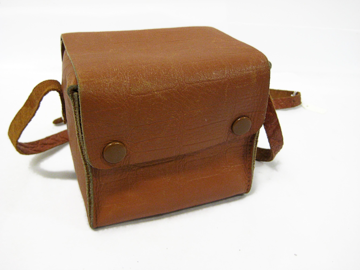 Ljósmyndavél. Ljósmyndavél í brúnni leðurtösku. Gerðin er "SIX-20 'BROWNIE' C, MADE BY KODAK" Utan um vélina er leðurtaska ljósbrún á lit. (Fær undirnúmer BÁ: 3323 A). Ljósmyndavél Halldórs Einarssonar frá Brandshúsum (1893-1977). Halldór gaf bróðursyni sínum, Einari Hallmundssyni vélina. Einar gaf syni sínum Árna Blandon Einarssyni vélina árið 1999.