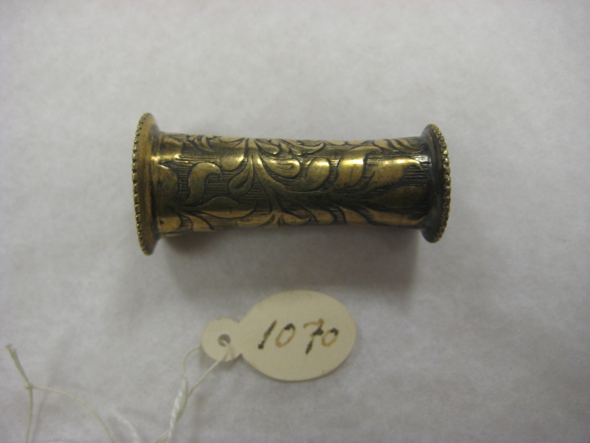 Skúfhólkur gylltur og grafinn rósum, 4,5 sm á lengd barmavídd 2,2 sm að ofan og 2,9 sm að neðan. Þessir þrír gripir BÁ: 1068-1070 eru smíðaðir af Ebeneser gullsmið Guðmundssyni á Eyrarbakka. Handa konu hans Sesselju Ólafsdóttur að líkindum fyrir giftingadag þeirra árið 1874. Dóttir þeirra hjóna var Ágústa kona Sigurðar Daníelssonar gullsmiðs á Eyrarbakka. Þeirra dóttir var Sesselja er gripina gaf til safnsins.