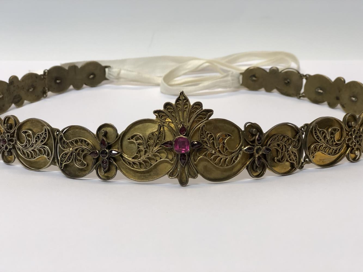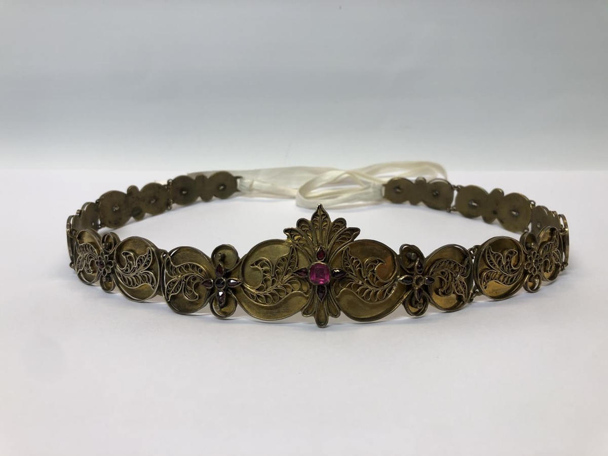 Ennisbelti koffur frá skautbúningi, gyllt með víravirkisrósum og sett rauðum steinum fyrir enni. Hafa verið sautján að tölu, einn fallinn úr. Þessir þrír gripir BÁ:1068-1070, eru smíðaðir af Ebeneser gullsmið Guðmundssyni á Eyrarbakka handa konu hans Sesselju Ólafsdóttur að líkindum fyrir giftingadag þeirra árið 1874. Dóttir þeirra hjóna var Ágústa kona Sigurðar Daníelssonar gullsmiðs á Eyrarbakka. Þeirra dóttir var Sesselja er gripina gaf til safnsins.