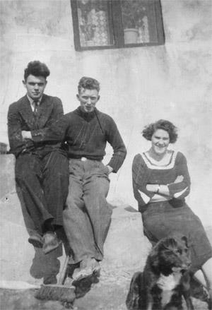 Systkinin Björn Guðjónsson og Þóranna Guðjónsdóttir á tröppunum í Réttarholti í Garði. Á milli þeirra situr Jónas Guðmundsson frá Rafnkelsstöðum í Garði. Myndin tekin seint á þriðja áratugnum.