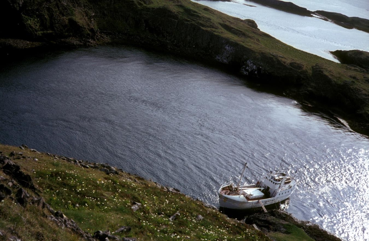 Breiðafjörður. Ferja/flóabáturinn Baldur við land í eyju. Stigi frá henni í land. Um borð í Baldri 1968