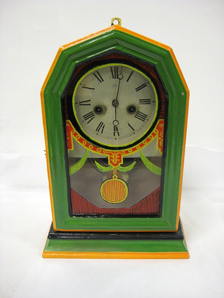 Veggklukka sem máluð hefur verið með skærum litum. Úr búi Elínar Aronsdóttur, móðursystur Arons í Kauphöllinni.