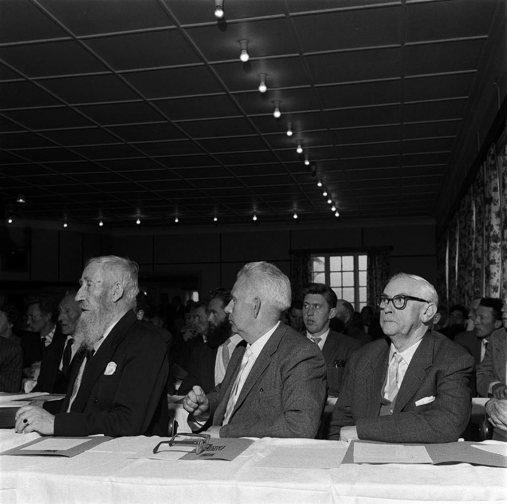 Horft yfir fundarsalinn. Í fremstu röð má greina, frá vinstri: Lárus Rist íþróttafrömuð með sítt skegg, Þórarinn Haraldsson bónda í Laufási í Kelduhverfi, Sigurður Sigurðsson sýslumaður á Sauðárkróki.