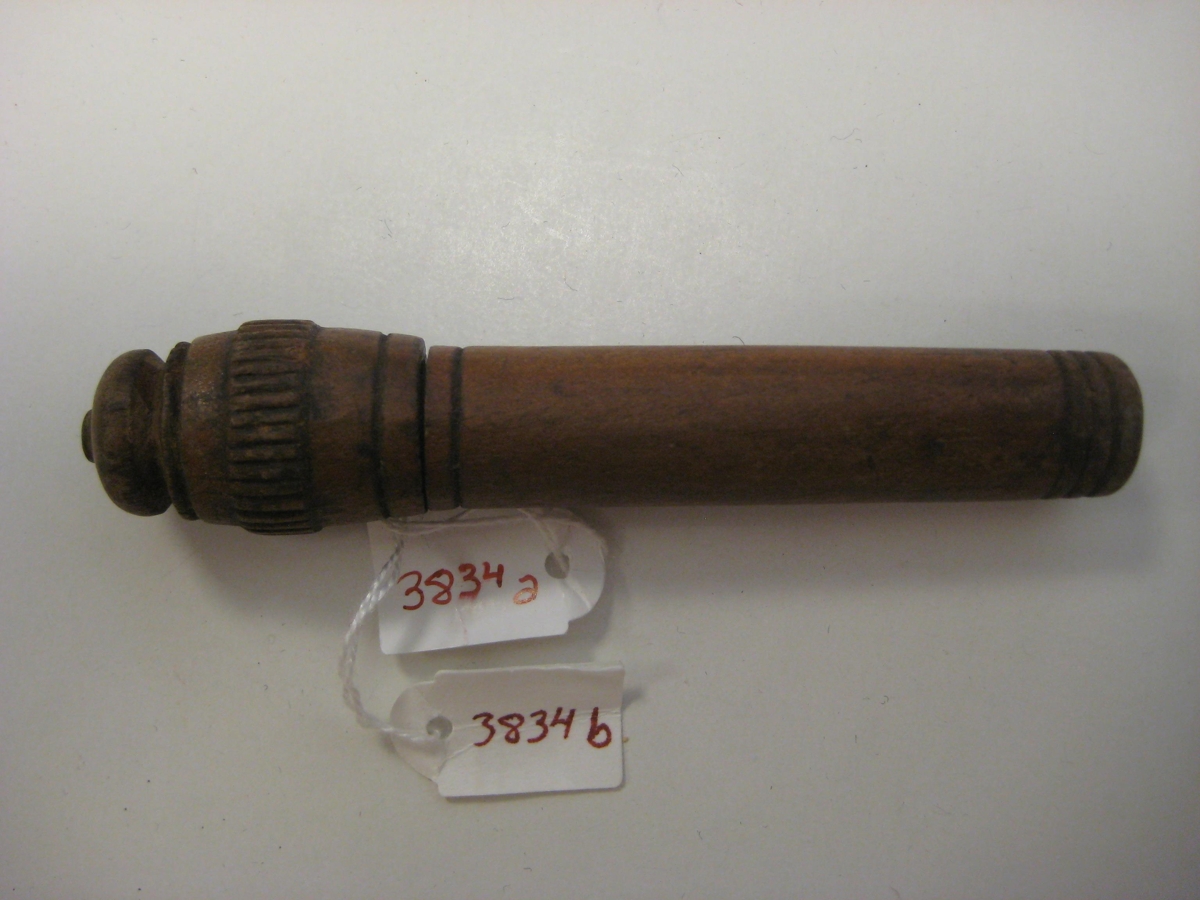 Nálarhús. 3834: Nálarhús með áskrúfuðu loki, fagurlega gert. Lokið er hins vegar orðið slitið og passar illa á húsið sjálft. 3834 A: Nál, sívöl. 3834 B: Netanál, flöt í endann.