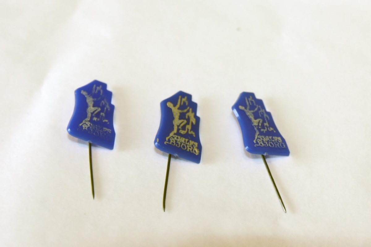 57 stk. af barmmerkjum í krukku.