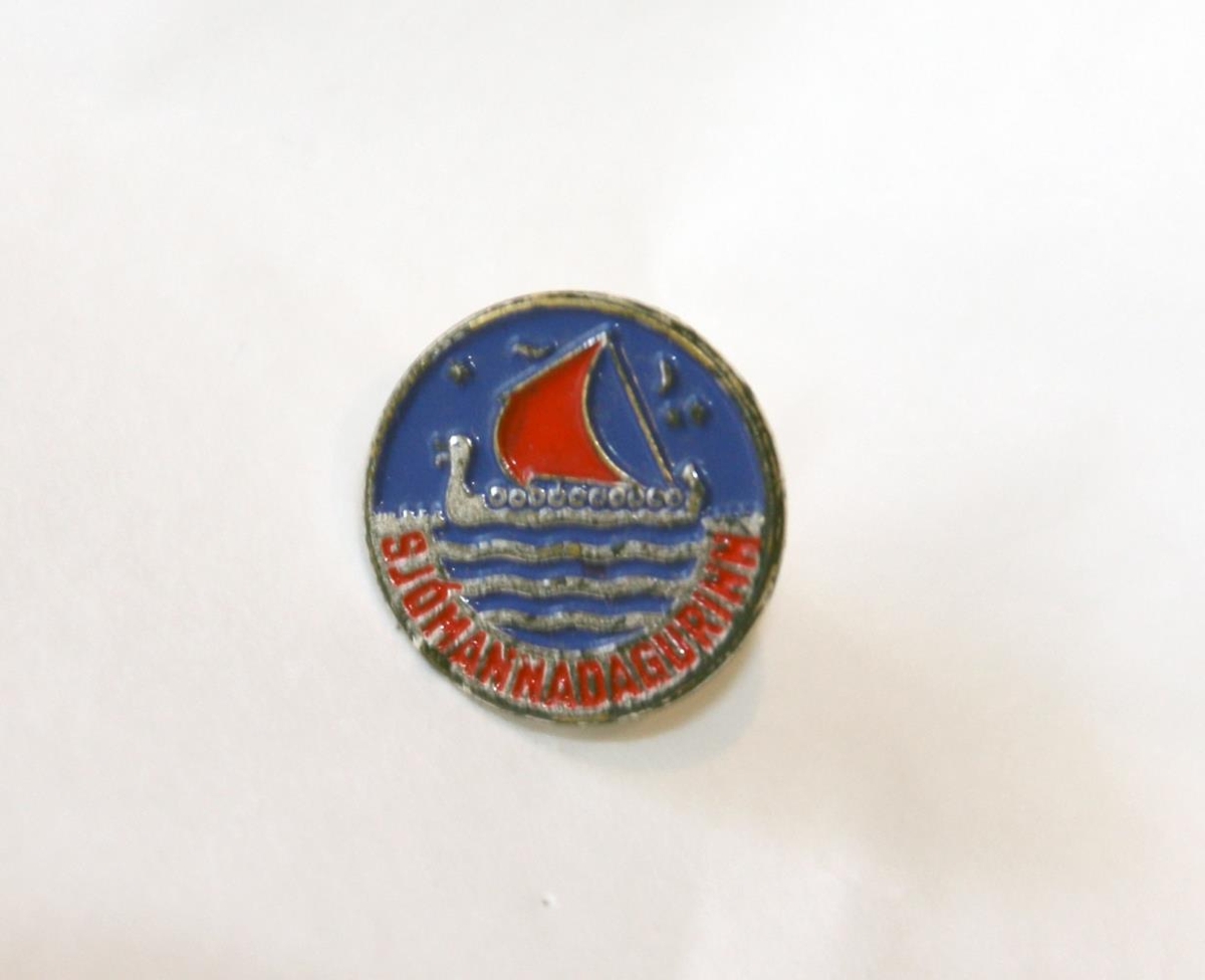 Mynd af víkingaskipi og texti Sjómannadagurinn, hefur verið þrykkt í. Blár himinn og rautt skip og texti.