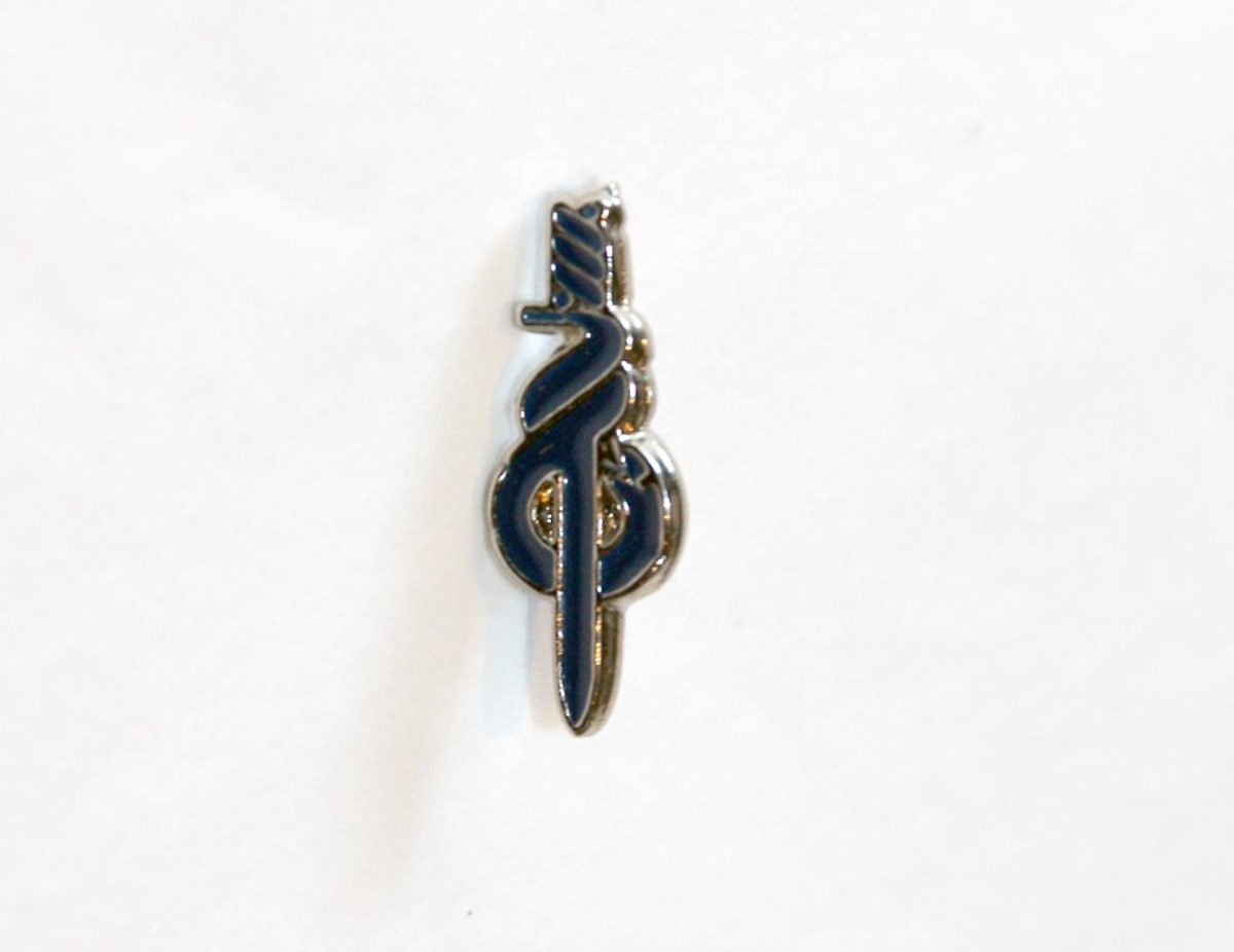 Merkið er óreglulegt í lögun og er tákn Krabbameinsfélagsins, snákur vafinn um sverð. Stálitað í grunninn með dökkbláum lit þrykkt á.