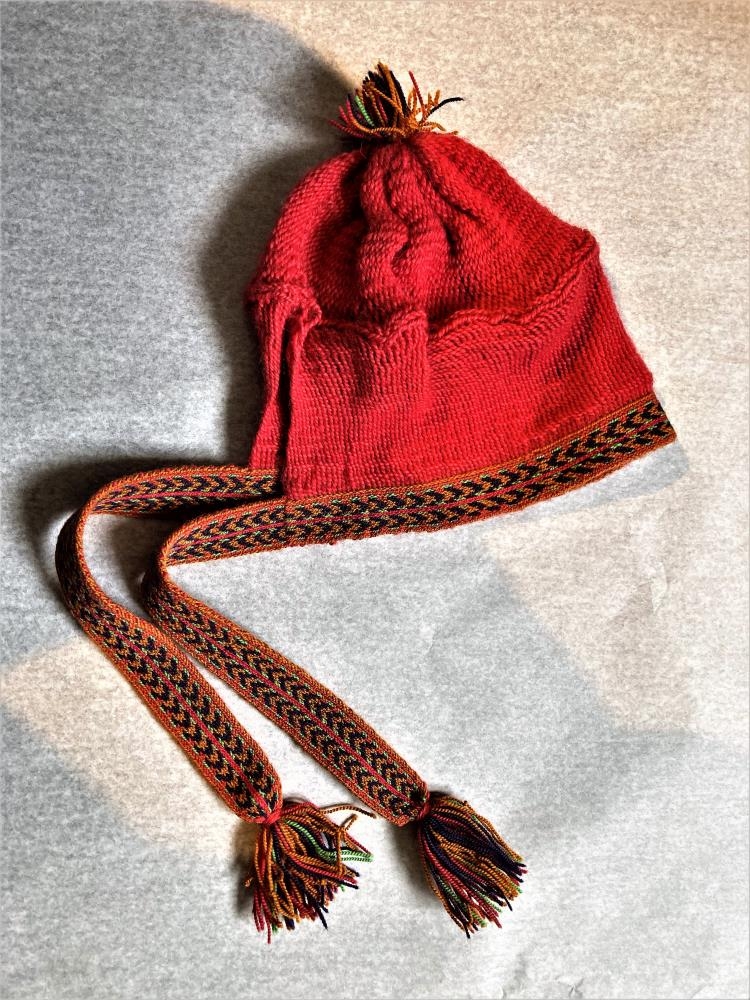Húfa, líklega gerð eftir aðferðum egypta af Ninnu Rathje. Er rauð með marglitum spjaldofnum böndum á köntum og dúsk á toppi