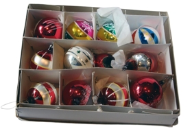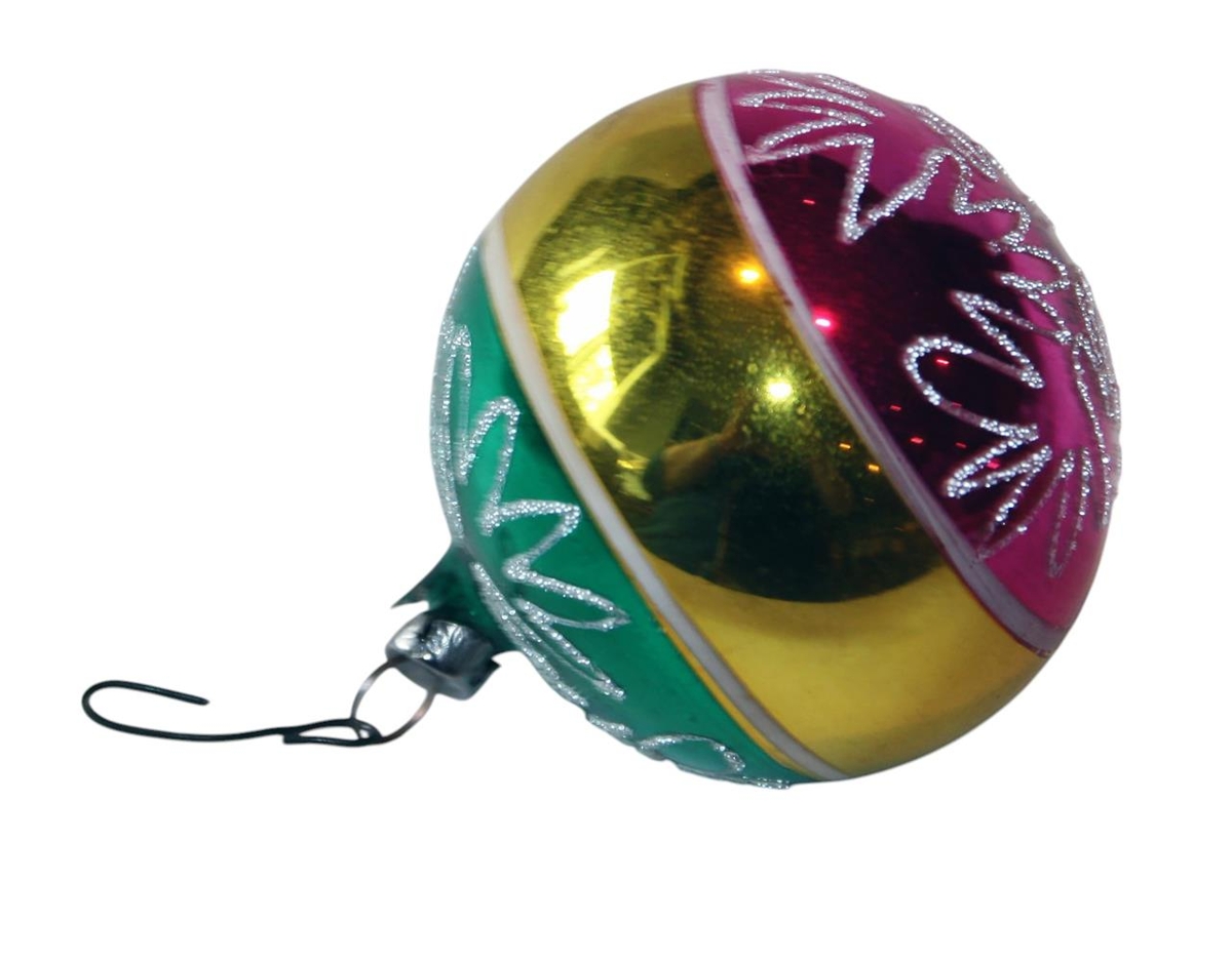 Bleik, gul og græn jólakúla skreytt með hvítum rákum.