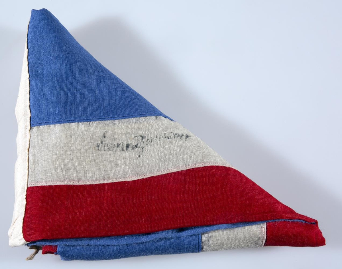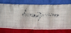 Fáninn er annar af tveimur slíkum fánum með áritun Sveins Björnssonar (f. 1881, d. 1952) sem vitað er um. Sveinn gaf fánann á uppboð sem haldið var til styrkar hermönnum sem börðust í síðari heimsstyrjöldinni.