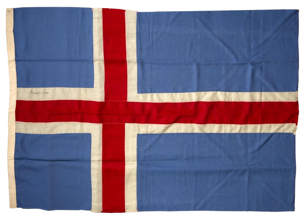 Íslenskur fáni með áritun Sveins Björnssonar, fyrsta forseta lýðveldisins. Fáninn er blár með hvítum krossi og rauðum krossi innan í hvíta krossinum. Áritunin er staðsett á hvíta krossinum vinstra megin við miðju fyrir ofan rauða krossinn.