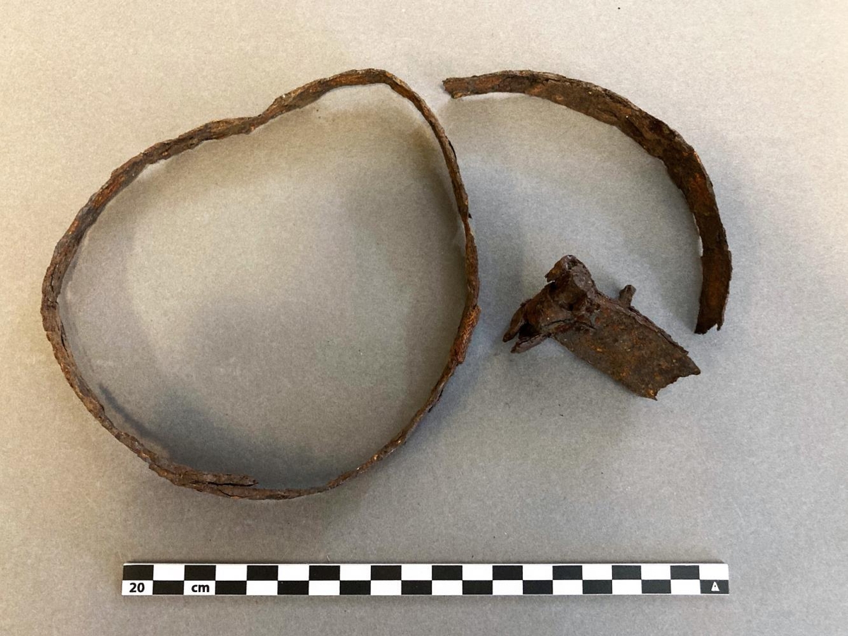 Járngripir, gjörð af kút, brot úr annari gjörð og ein kistulöm úr járni: Heil gjörð 13-14 cm í þvermál og 1,5 cm á breidd. Brot úr annari gjörð um 12 cm löng, 1,5 cm á breidd. Lömin er 5,5 cm.