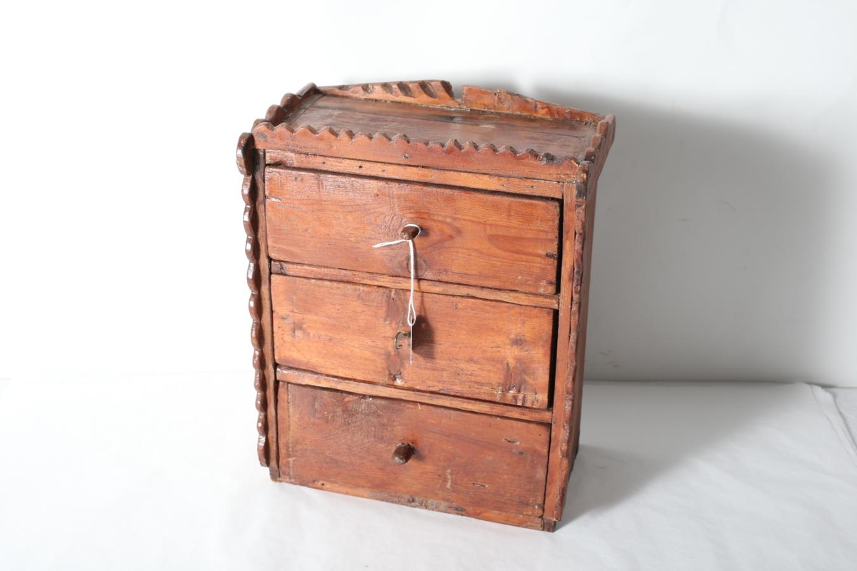 Lítil brún kommóða með þremur skúffum og útskornum brúnum. Lítil brún viðarhandföng á hverri skúffu. Úr búi mæðginanna Aðalheiðar Sigurðardóttur og Karls Jónssonar á Galtastöðum fram í Hróarstungu.