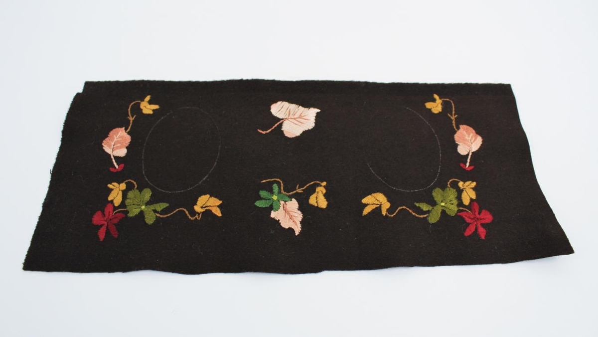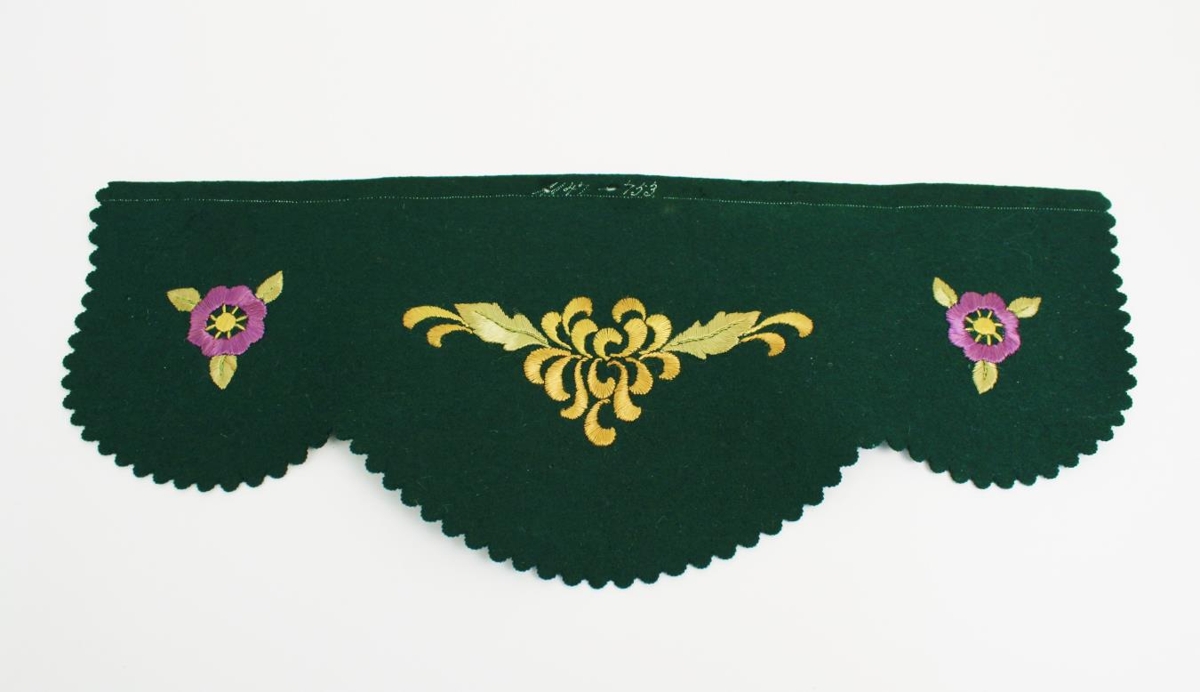 Þrír dúkar, til að hafa ofan á hornhillu. A. Ljósgrænn útsaumaður með rauðu, bleiku, grænu og ljósu garni stærð 44,0 x 14,0. B. Dökkgrænn útsaumaður með fjólubláu, gulu og grænu garni stærð 42,0 x 16,0. C. Brúnn útsaumaður með grænu, rauðu, bleiku og brúnu garni stærð 46,0 x 16,0.