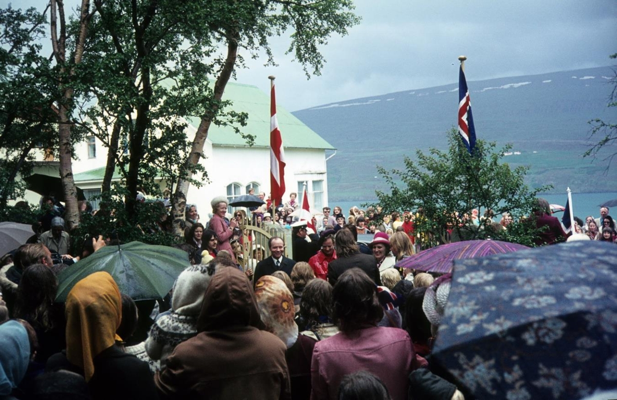 Lystigarðurinn á Akureyri. Margrét danadrottning á Akureyri. Mannfjöldi í lystigarði 1973. Kristján Eldjárn og Margrét Þórhildur fyrir miðri mynd.