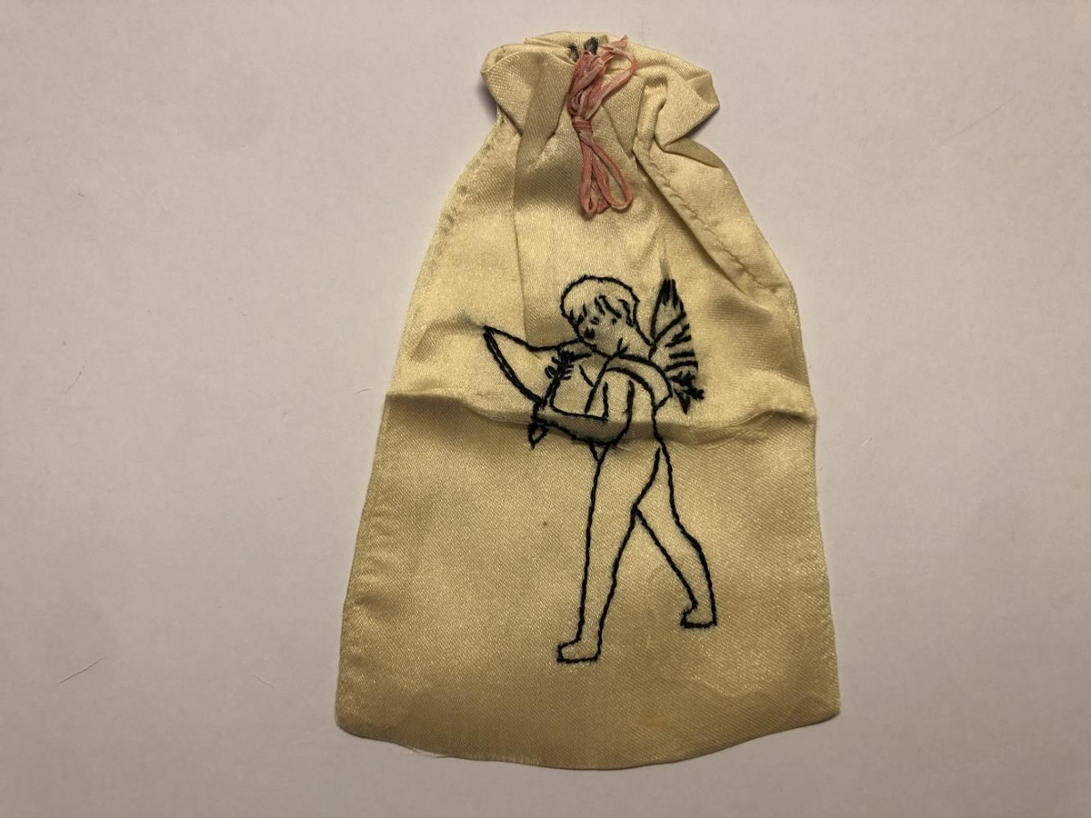 Öskupoka sendir Arnold. Handsaumaðir úr hvítu silki og ísaumaðir með svokölluðu „Flokk-silki“. Með kögri og stundum dúskum. Fallega dregnir saman. Amor með boga saumað með svörtu.