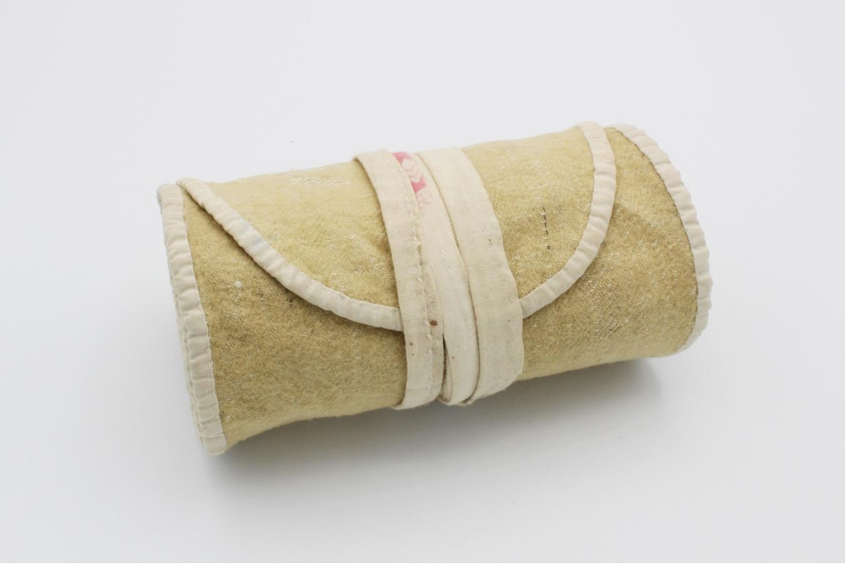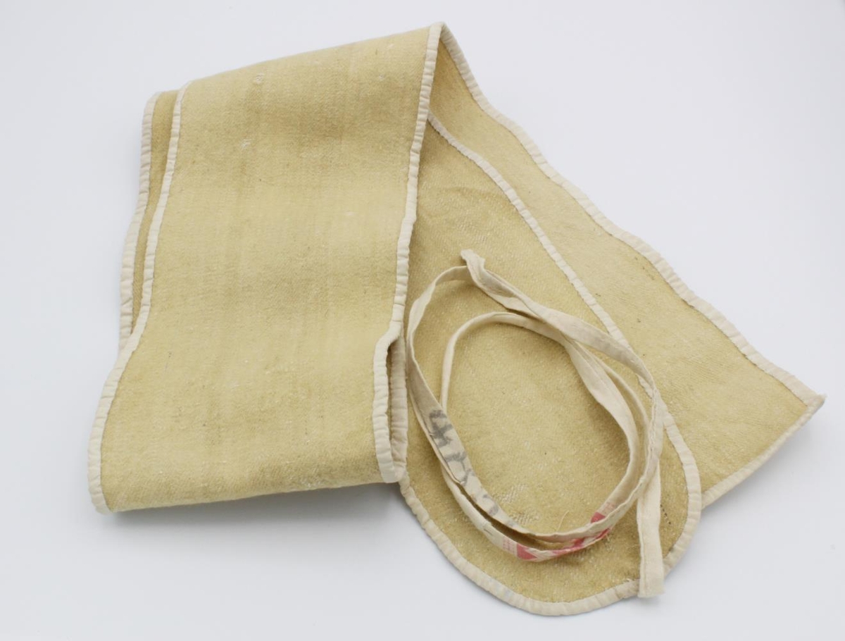 Ull, gulleit með bómullar bryddingu og bendilbandi úr hveitipoka.Úr fórum Ingveldar Eiríksdóttur í Stíghúsi á Eyrarbakka.