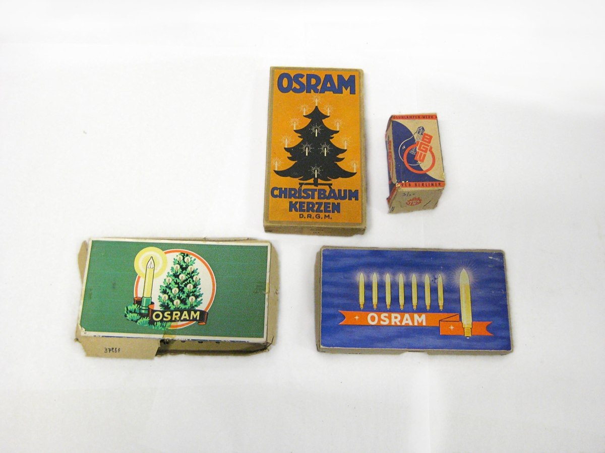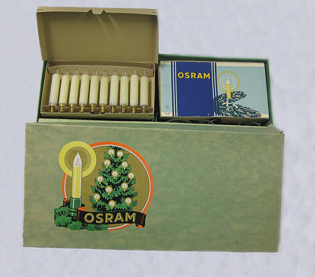Ljósaseríur. Jólaljósaseríur. 3786: 16 ljósa jólatréssería frá Osram, geymd í þar til gerðum kassa, merktum Osram - grænn að lit. Vírar seríunar eru harðir og hægt að laga eftir vild. Ljósastæðin eru með öflugum málmklemmum, til að festa stæðin á greinar. Með fylgja tvær öskjur af 3W ljósaperum. 10 kertalaga ljósaperur í hverjum þeirra. Einnig fjórar perur í lausu, vafðar inn í pappír. 3786 A: Sama utan á kassalokinu stendur "Weihnachtsbaumbeleauchtung". 3786 B: Sama. utan á kassalokinu stendur "Lindner". 3786 C: Sama nema að þessi sería hefur öðruvísi greinafestingar. Þær eru hringlaga og ætlaðar til að þræða upp á greinarnar. Framleiðandinn er Philips. Kassinn er skrautlegur með mynd af jólasveininum á sleða. Sex perur í lausu fylgja með. 3786 D: Sama þessi sería hefur þó lent í ýmsu. Virðist oft viðgerð og mikið notuð. Hún er ekki í sérstökum seríukassa en með fylgir kassi með nokkrum perum og perufestingum frá Osram. 3786 E: Útiljósasería, 15 ljósa marglitar perur. Níu aukaperur fylgja í tveimur kössum. Þrír aukaþéttihringir úr gúmmí fylgja. Hör/bómullarefni er í botni kassans til að verja seríuna fyrir hnjaski. 3786 F: Sitthvor kassinn af ljósaperum. Í öðrum þeirra eru átta hvítar kertaperur en í hinum 10 litaðar kertaperur. Innan í þeim kassa er ritað eftirfarandi á miða: ,,Þessar kertaperur eru of stórar fyrir ljósastæðið, þarf stærra stæði". Perurnar eru allar framleiddar af Osram.