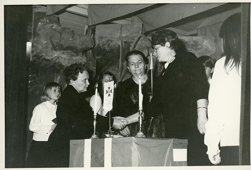 Barnastúkan Siðsemd nr. 14 í Garði var stofnuð 4. desember árið 1891. Hér er verið að halda upp á 75 ára afmæli stúkunnar í samkomuhúsinu í Garði árið 1966. Una Guðmundsdóttir frá Sjólyst í Garði var gæslumaður stúkunnar á þessum tíma, hér tekur hún við góðum gjöfum og kveðjum í tilefni afmælisins. Á myndinni má þekkja Helgu Þorsteinsdóttur frá Gaukstöðum í Garði og Sigrúnu Oddsdóttur frá Nýjalandi í Garði.