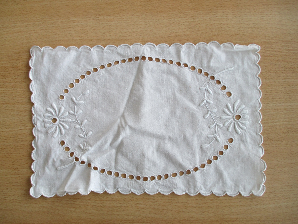 Bakkadúkur saumaður með fylltum flatsaum og gatasaumi, handsaumaður tungukantur. Unnið af Guðlaugu frá Syðra-Velli í Gaulverjabæjarhreppi, seinna búsett á Galtastöðum í sömu sveit.