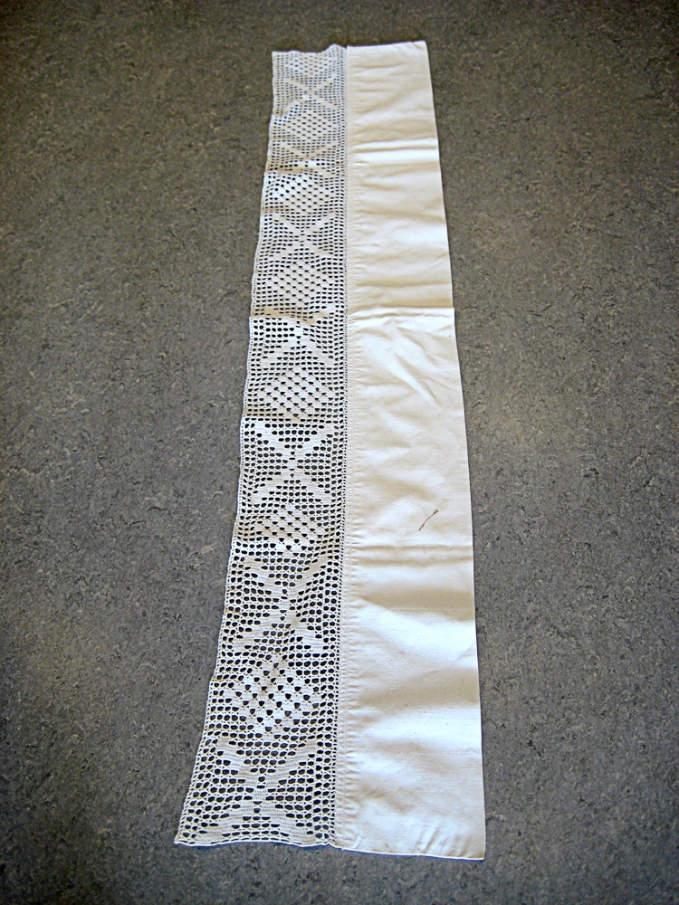 Gardínukappi með hekluðu milliverki. Laufey Indriðadóttir frá Ásum kom með þetta lín, sem var frá Maríu Hansdóttur móður bræðranna á Kópsvatni. María bjó þar 1932-1945.