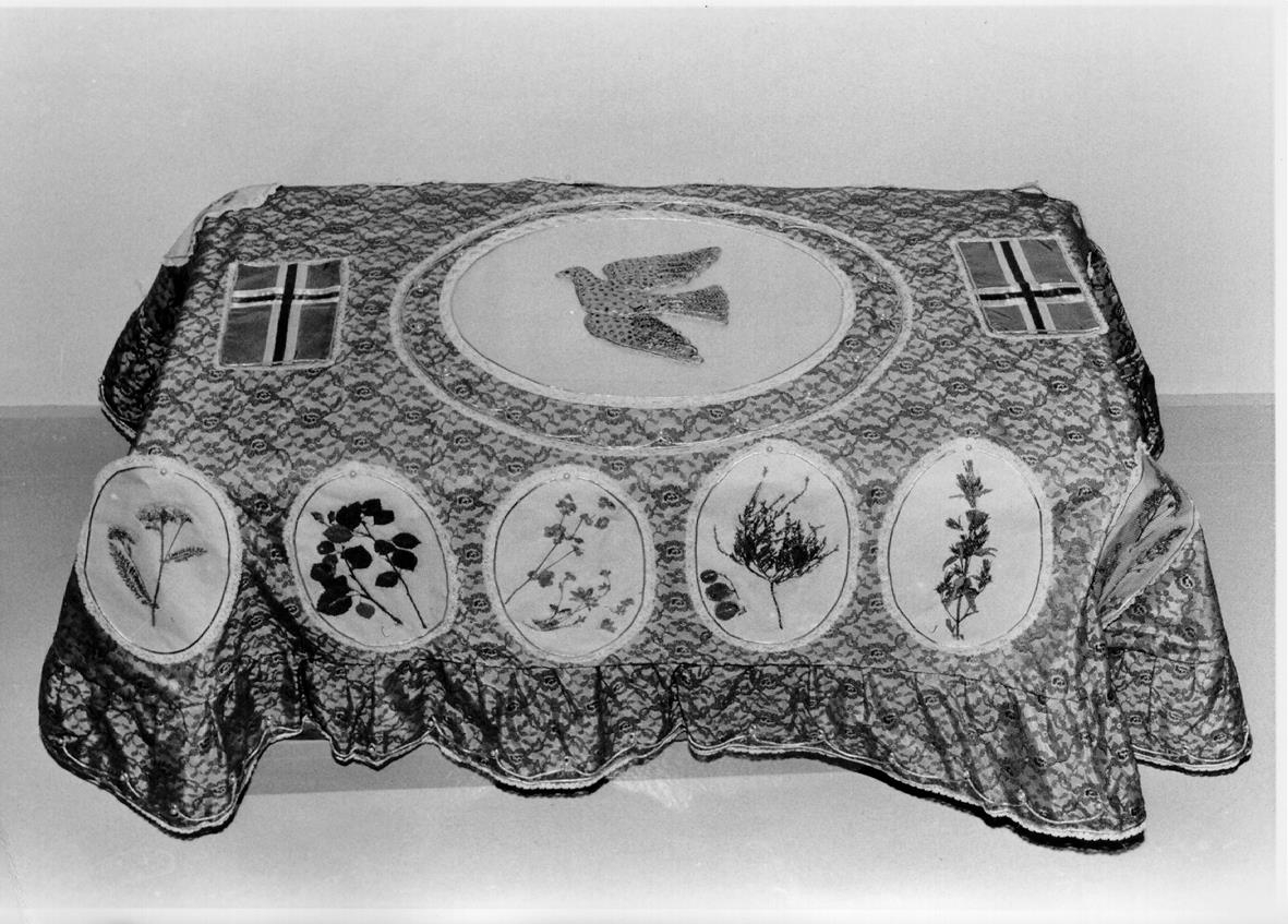 Kistuklæði, blátt klæði. Gerandi Ingibjörg Jónsdóttir Guðmundsson, bjó í Kanada en lést í Kalíforníu USA. Kom að Gaulverjabæ.