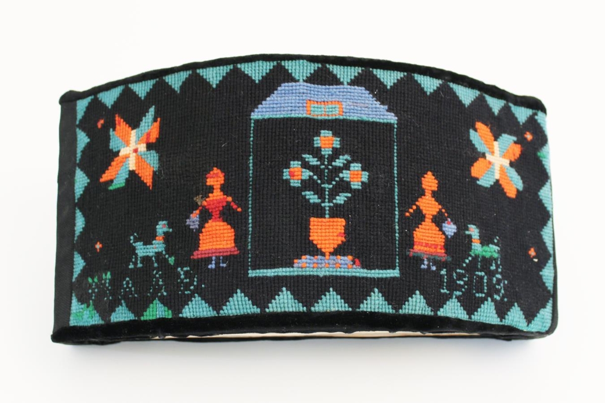 Saumað af Margréti Árnadóttur. Grindin er líklega úr timbri, yfirdekkt og útsaumað með svörtu á svart og lituðu garni. Til þess að hengja upp á vegg. Margrét dó 8 ára gömul, Árnadóttir frá Stíghúsi á Eyrarbakka.